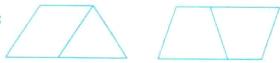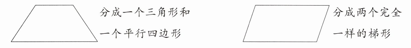 解析第一个图:从梯形上底的一个端点作腰的平行线段,得到的两个图形即为所求。第二个图:如图,在平行四边形ABCD的AD边上取一点E(点E不是AD边的中点或端点),量出AE的长度,在AD的对边BC上取一点F,使CF=AE,连接EF,梯形ABFE和梯形EFCD即为两个完全相同的梯形。