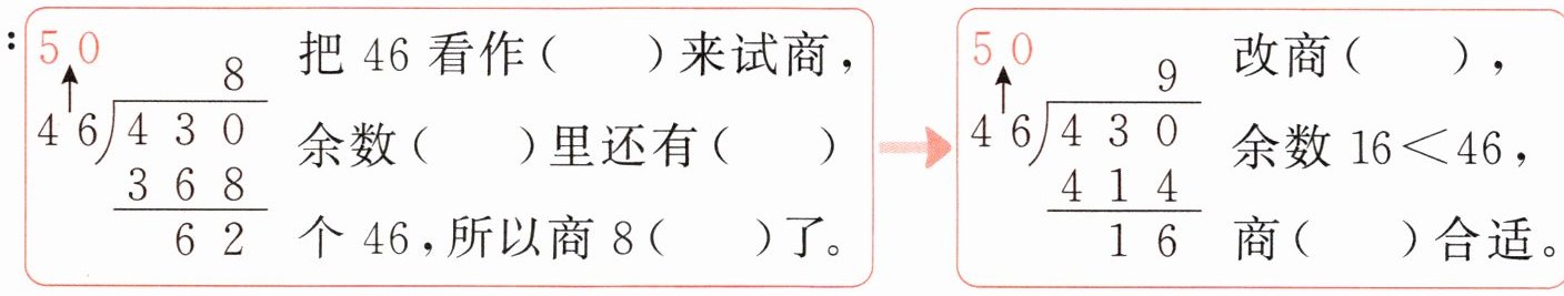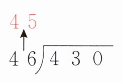 )。丽丽:$\begin{array}{r} 45\\ 46\enclose{longdiv} {430}\end{array} $把46看作45来试商,2个45是90,8个45是360。余下的70里还有(
