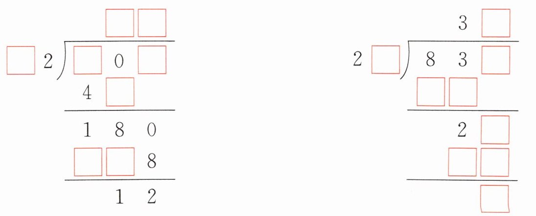 $\begin{array}{r} □□\\ □2\enclose{longdiv} {□0□}\\ 4□\\ \hline 180\\ □□8\\ \hline 12\end{array} $