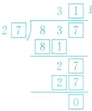 ③27×□ 的结果小于或等于2□→商的个位数字是1,27×□ =27×1=27。