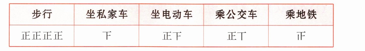 解析用“正”字记录数据时,1笔代表1人,1个“正”字代表5人,据此数出每种出行方式各有多少人。