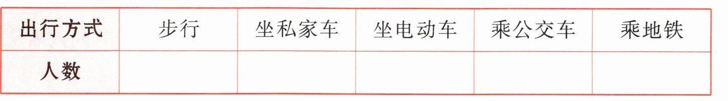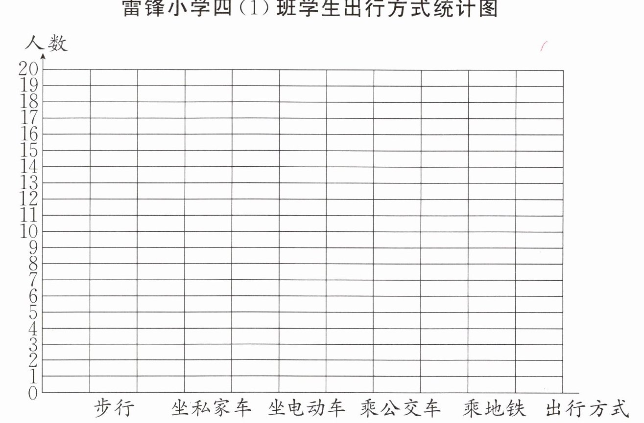 观察条形统计图可知,每格代表1人。哪种出行方式有几人,就在统计图中对应的位置涂画几个格子。