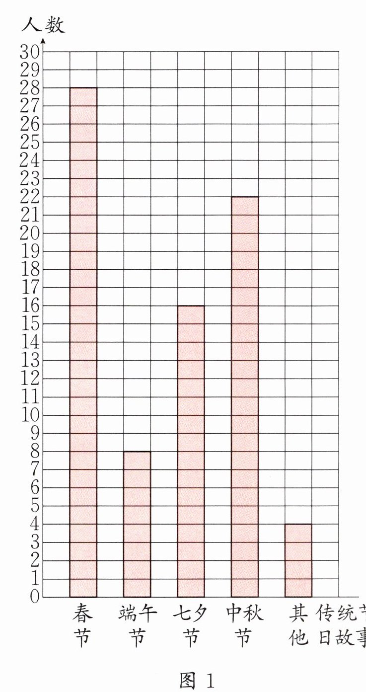 解析: 题图1:最喜爱春节故事的有28人,最喜爱端午节故事的有8人,最喜爱七夕节故事的有16人,最喜爱中秋节故事的有22人,最喜爱其他传统节日故事的有4人。