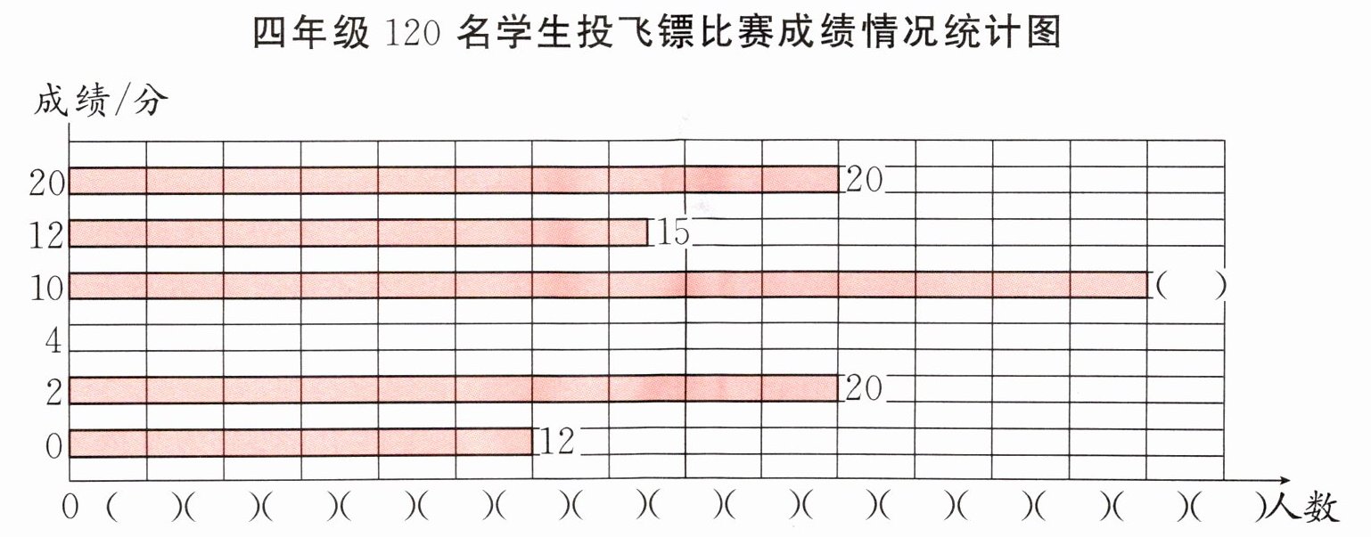 3 四年级 120 名学生进行投飞镖比赛,规定如下:每名学生投掷两次,投中靶心(白色部分)得 10 分,投中圆环(红色部分)得 2 分,投不中不得分。胡老师根据学生们的比赛成绩绘制了条形统计图。