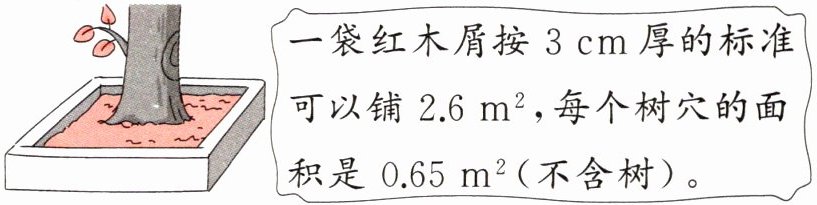 一袋红木屑按3 cm厚的标准可以铺$2.6m^2,$每个树穴的面积是$0.65m^2($不含树)。
