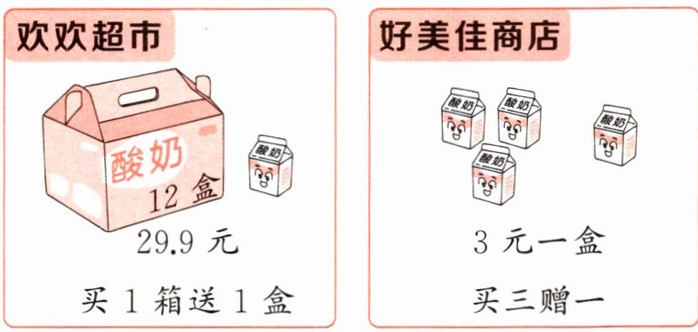 6 国庆节期间,欢欢超市和好美佳商店都对同一款酸奶开展促销活动,如下图。请你帮小曲对比两家店的酸奶单价,判断小曲去哪家店购买更合算。