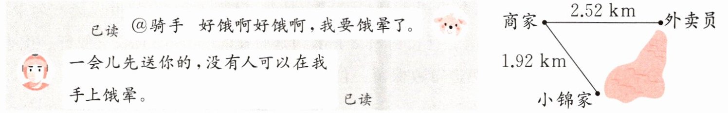 (2)1.92÷24=0.08(时) 0.08时=4.8分 答:取餐后需要4.8分钟到达小锦家。