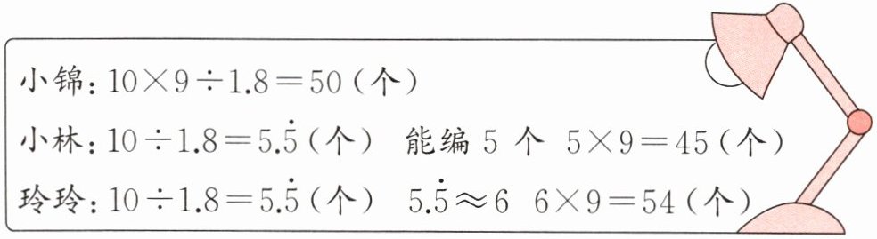 小林:$10÷1.8= 5.\dot{5}($个) 能编5个 5×9= 45(个)