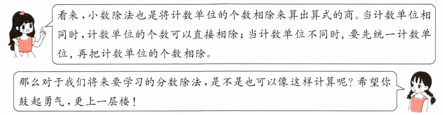 )$。看来,小数除法也是将计数单位的个数相除来算出算式的商。当计数单位相同时,计数单位的个数可以直接相除;当计数单位不同时,要先统一计数单位,再把计数单位的个数相除。