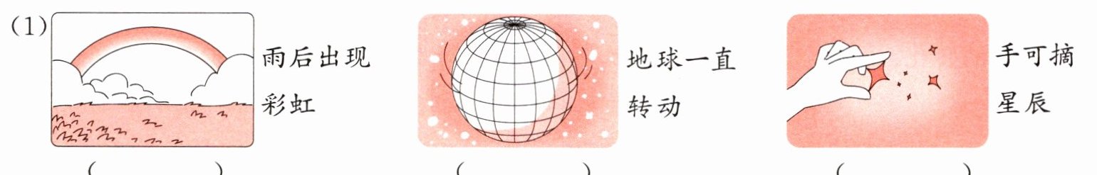 (1)雨后出现彩虹是不确定事件,因此是可能发生;地球一直转动是一个客观事实,因此是一定发生;星星在天上,手不可能摘到,因此手可摘星辰不可能发生。