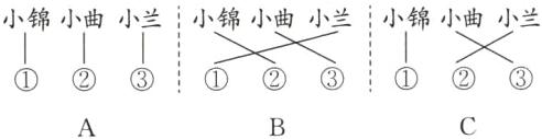 解析选项A、B、C均可能发生,用①②③分别表示小锦、小曲和小兰准备的礼物,举例如下图。