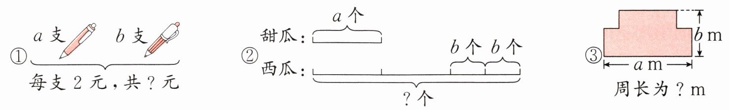 ①一共(a + b)支笔,每支2元,共[(a + b)×2]元,也就是(2a + 2b)元。