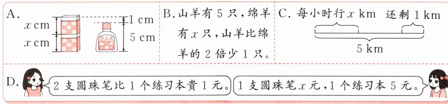 (3)(易错题)小锦列出了一个方程2x-1= 5,这个方程不能用来表示下面(