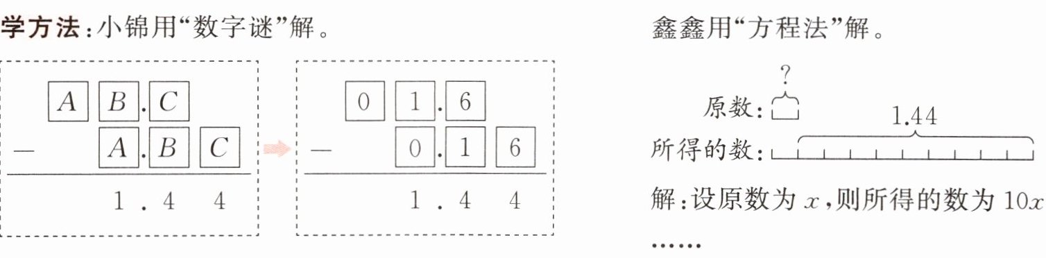 4 把一个小数的小数点向右移动一位,所得的数比原数大1.44。原数是多少?