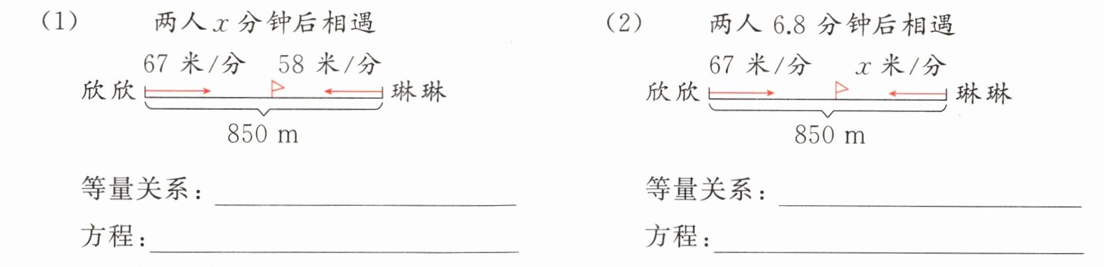 (2)等量关系:欣欣走的路程+琳琳走的路程=总路程;方程:67×6.8+6.8x=850