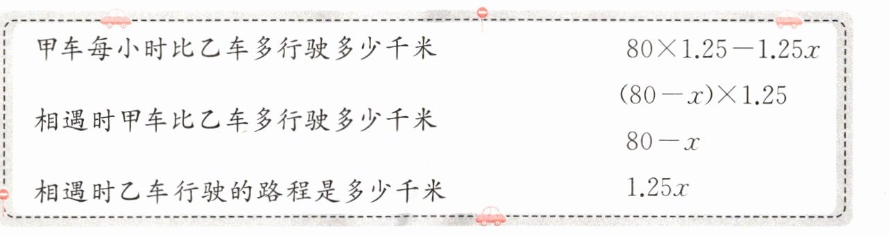 2 甲、乙两辆车同时从 A、B 两地开出,相向而行,经过 1.25 小时相遇。已知甲车的速度比乙车快,甲车每小时行驶 80 km,乙车每小时行驶 x km, ?