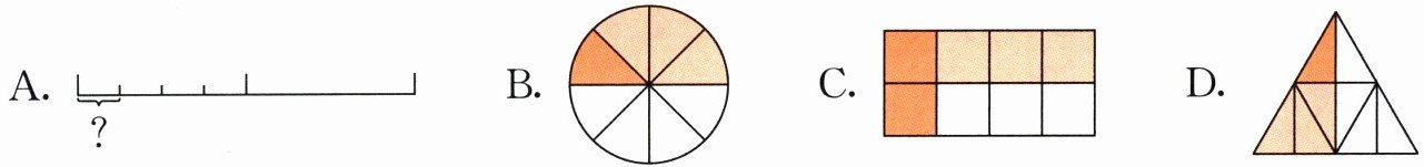 1. 我国数学家华罗庚曾说过:“数缺形时少直观。”这提示我们可以用图形表示算式的含义,下面各图中不能表示$\frac{1}{2} × \frac{1}{4}$的是( )。