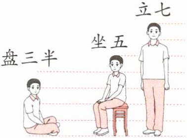 4. 我国古代画论中的"立七坐五盘三半"是指一个人站立、坐着和盘腿坐着时高度关系(如下图)。如果一个人站立时的高度昰182 cm.那么他坐着时的高度比盘腿坐着时高度高多少厘米?