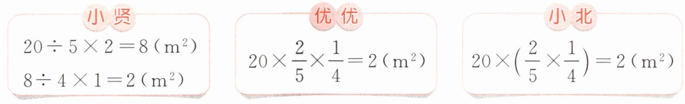 优优:连续求一个数的几分之几是多少,用连乘计算。$20× \frac{2}{5}$表示的是白菜的种植面积,$20× \frac{2}{5}× \frac{1}{4}$表示的是白菜种植面积的$\frac{1}{4}$,即萝卜的种植面积。