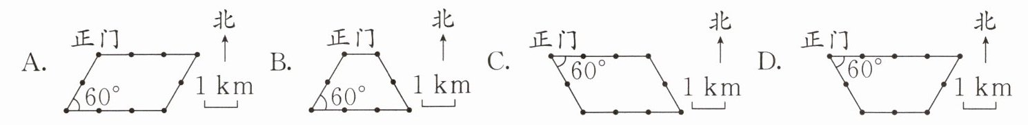 2. 某公园摆渡车从正门向正东方向行驶 3 km 后,再向西偏南 60°方向行驶 2 km,然后向正西方向行驶 3 km,最后向北偏东 30°方向行驶,驶回正门。正确的路线图是(