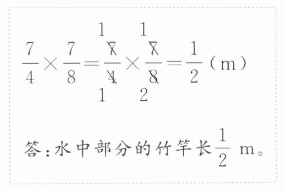 4 一根竹竿长$\frac {7}{4}m$,其插入水中的部分占全长的$\frac {7}{8}$,水中部分的竹竿长多少米?假如你是老师,请你圈出下面解题过程的错误之处,说明错误原因并正确解答此问题。