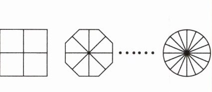 )。④《周髀算经》中记载“圆出于方”,方法就是把一个正方形切去四个角变成正八边形,再切去八个角变成正十六边形,再切角变成正三十二边形……当正多边形的边数无限增多时,这个正多边形就无限接近于圆,如右图。正多边形中心点的位置相当于圆的(