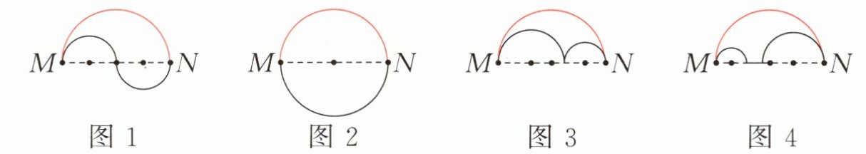 图3:假设黑色实线的小圆直径为a,大圆直径为b,则黑色实线的路线长为$\pi× a÷2+\pi× b÷2=\frac{\pi(a+b)}{2}$,红色实线的路线长为$\pi×(a+b)÷2=\frac{\pi(a+b)}{2}$,两条路线一样长。