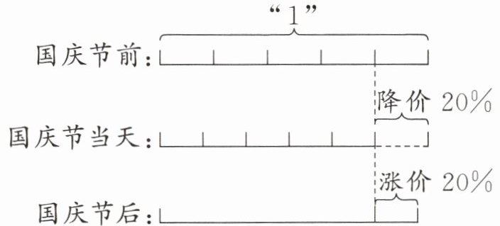 3 小明遇到了这样一道题目:一套图书在国庆节当天降价了20%,在国庆节后又涨价了20%。他在计算国庆节前后的价格变化幅度时,是这样列式计算的:20%-(1-20%)×20%= 4%。请结合他画的线段图,判断他的方法是否正确,并说明理由。