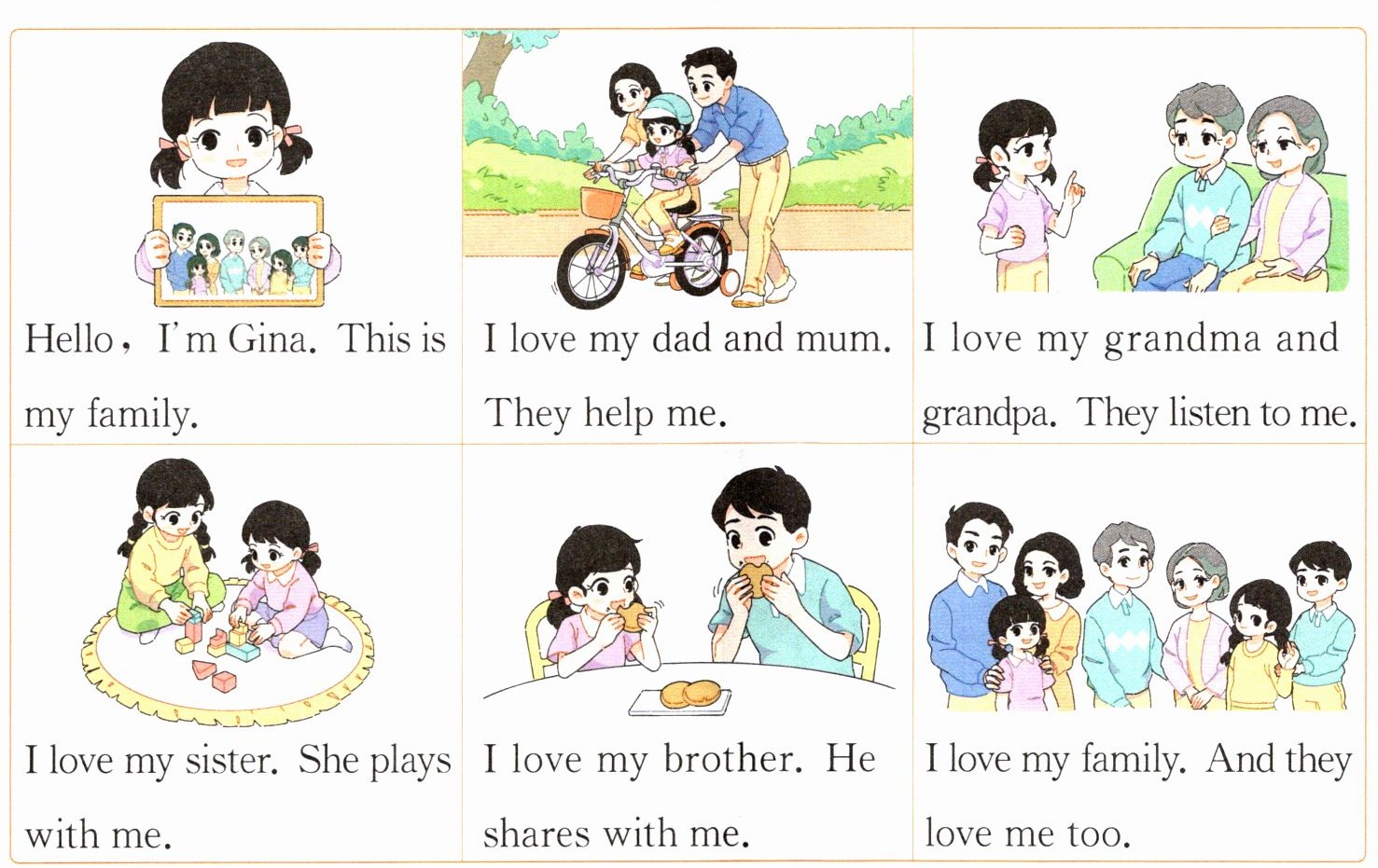 1. 句意:我们在Gina的家庭里看到 个人。分析:由绘本可知,Gina的家里有爸爸妈妈、爷爷奶奶、哥哥姐姐和Gina,共七个人,故选B。