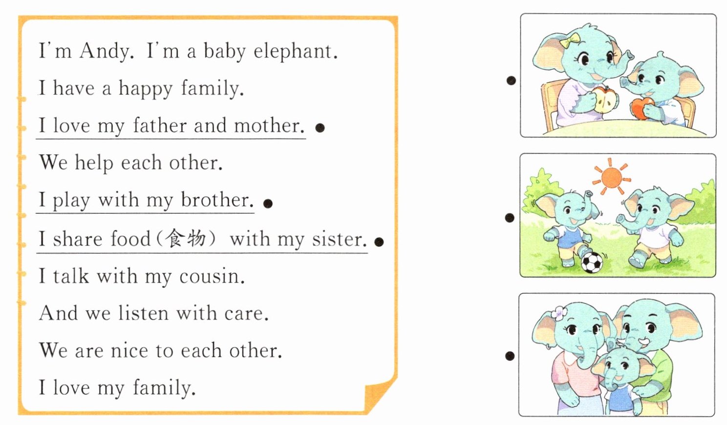 √ A. The baby elephant has a happy family. √ B. The elephant family members love each other.