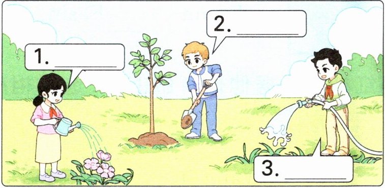1. B 2. C 3. A 解析 1. $图意$:女孩在给花浇水$。$ 分析$:$B项意为"我给花浇水"$,$故选 B$.$ 2. $图意$:男孩在种树$。$ 分析$:$C项意为"我种下一棵新树"$,$故选 C$.$ 3.$图意$:男孩在给草浇水$。$ 分析$:$A项意为"我给草浇水"$,$故选 A$.$