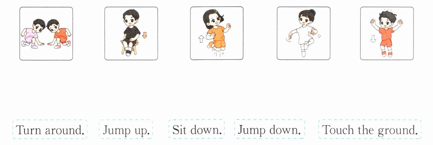 解析 第一幅图:男孩们触碰地面。 分析:“Touch the ground.”意为“触碰地面”,故将第一幅图与“Touch the ground.”连线。 第二幅图:男孩坐下。 分析:“Sit down.”意为“坐下”,故将第二幅图与“Sit down.”连线。 第三幅图:女孩向上跳。 分析:“Jump up.”意为“向上跳”,故将第三幅图与“Jump up.”连线。 第四幅图:女孩转身。 分析:“Turn around.”意为“转身”,故将第四幅图与“Turn around.”连线。 第五幅图:男孩向下跳。 分析:“Jump down.”意为“向下跳”,故将第五幅图与“Jump down.”连线。