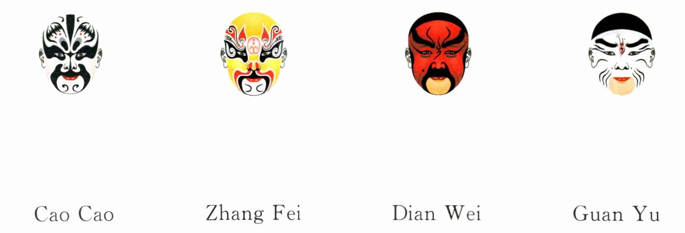 Look! Here are some Beijing opera masks. This is a black mask. It's Zhang Fei's. He is fair(公正的). This is a red mask. It's Guan Yu's. He is loyal(忠诚的). This is a white mask. It is Cao Cao's. He is crafty(狡诈的). This is a yellow mask. It is Dian Wei's. He is fierce(凶猛的).