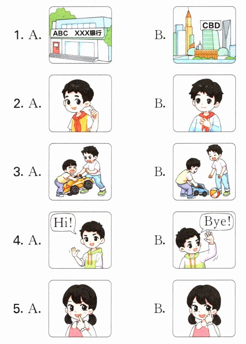 1. 圈 B 2. 圈 A 3. 圈 B 4. 圈 A 5. 圈 B 解析 1. 所听内容:CBD。故圈 B。 2. 所听句意:指向你的耳朵。 关键信息:ear。故圈 A。 3. 所听句意:朋友们分享。 关键信息:share。故圈 B。 4. 所听句意:嗨!我叫吴天天。 关键信息:“Hi!”。故圈 A。 5. 所听句意:看着我的眼睛。 关键信息:eyes。故圈 B。