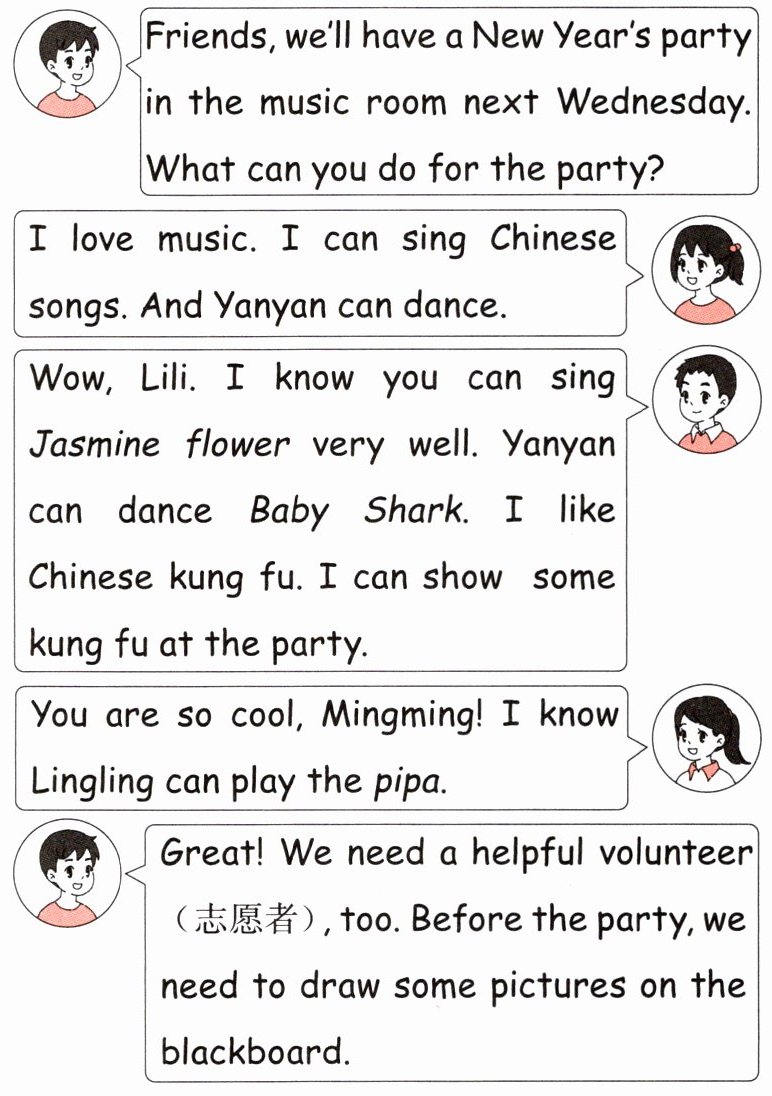 三、Li Hua 正在和小伙伴们讨论新年派对的安排。阅读对话,完成相应题目。