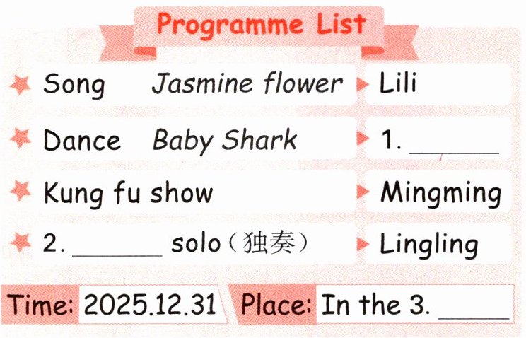 (一)根据对话,帮助 Li Hua 完成节目单。