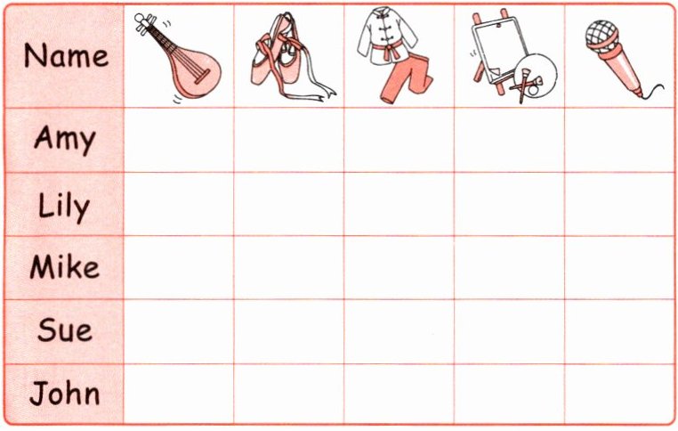 解析 Amy:依据:I love music. I can sing songs. 分析:Amy 会唱歌,故 Amy 栏应在话筒一格打“√”。 Lily:依据:And Lily can dance. 分析:Lily 会跳舞,故 Lily 栏应在舞鞋一格打“√”。 Mike:依据:Miss Li,I can draw cartoons for the party. 分析:Mike 会画漫画,故 Mike 栏应在画画工具一格打“√”。 Sue:依据:I know Sue can play the pipa ... 分析:Sue 会弹琵琶,故 Sue 栏应在琵琶一格打“√”。 John:依据:... John can do some kung fu. 分析:John 会练一些武术,故 John 栏应在武术衣服一格打“√”。
