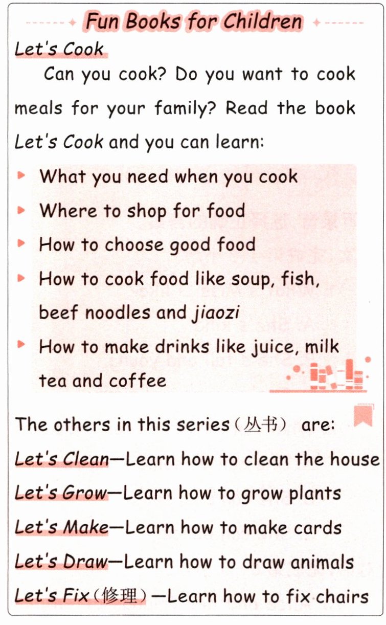 )1. Let's Cook is a book about cooking meals.(