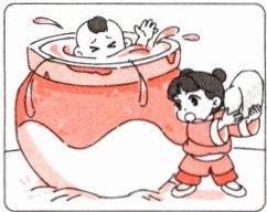 A boy kicks(踢) the ball into a large vat. The vat is full of water. All the children run to the vat. They talk about how to take the ball out. One boy steps on another boy's shoulders to get (拿到)the ball. Suddenly he slips(滑倒), and falls into the vat. The children are scared(害怕的)and don't know what to do. Then Sima Guang has an idea. He picks up a big stone and breaks(打破)the vat with it. The water flows out. The boy is saved(获救).