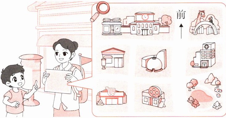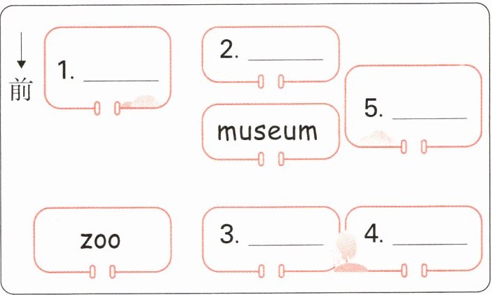1.post office 2.cinema 3. library/bookstore 4. Where is the hospital? 5. 示例:It's behind the school.