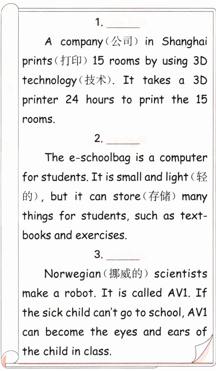 三、(一)C (二)1.C 2.A 3.B (三)C 解析 (一) 依据:A. It takes a 3D printer 24 hours to print the 15 rooms. B. ... it can store many things for students, such as textbooks and exercises. C. If the sick child can't go to school, AV1 can become the eyes and ears of the child in class. 分析:3D打印机 24 小时内能打印 15 个房间,A 错误。电子书包能存储课本,B 错误。在挪威,课堂上能看到 AV1,C 正确。故选 C。 (二) 1. 依据:A company in Shanghai prints 15 rooms by using 3D technology. 分析:本段核心内容是3D 打印技术,故选 C。 2. 依据:The e-schoolbag is a computer for students. 分析:本段核心是电子书包,故选 A。 3. 依据:It is called AV1. If the sick child ... in class. 分析:本段核心是机器人 AV1,故选 B。 (三) 依据:A company in Shanghai prints 15 rooms by using 3D technology. The e-schoolbag is a computer for students. Norwegian scientists make a robot. 分析:三段内容都与科学技术相关,故选 C。