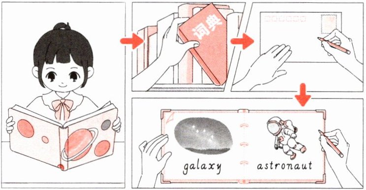 to look up(查阅) "galaxy" and "astronaut".3. I write these words on a
