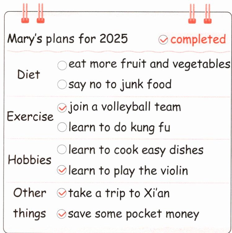 )4. To complete all her plans, Mary needs to ______ next.A. learn to play the violin