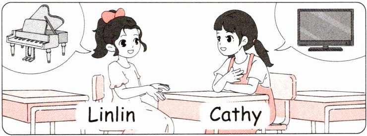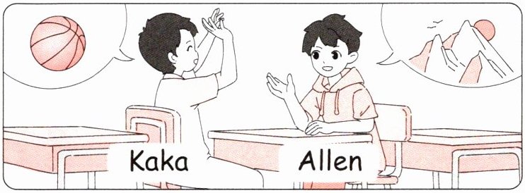 三、同学们在和交换生沟通彼此的爱好。根据图片提示,用合适的内容补全对话。