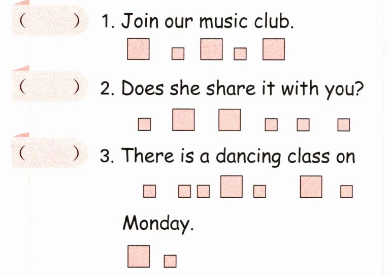 1. taking trips 2. listening to music 3. afternoon tea 4. singing 5. dancing 6. morning tea(1、2题可互换,4、5题可互换)