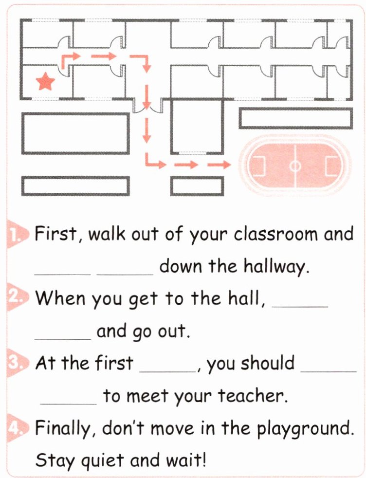 一、学校在组织消防疏散演练。请根据消防疏散图,用合适的词汇补全句子。