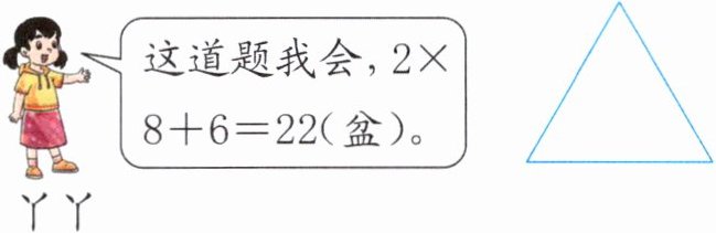 不对 理由:园艺师傅在左、右两条边上各摆8盆花,底边上摆6盆花,有2×8+6=22(盆)。丫丫忘记加上园艺师傅先在花坛的三个顶点处各摆的1盆花了,所以花坛一周共摆了22+3=25(盆)花。(合理即可)