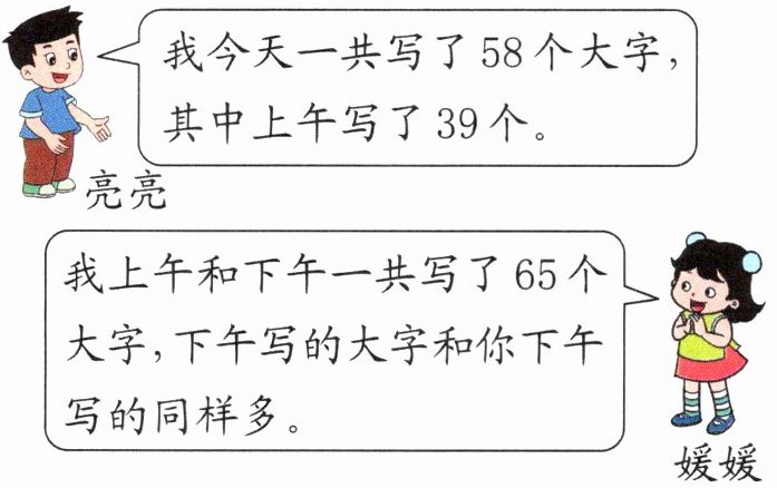 解析:先算出亮亮下午写的大字个数,也就是媛媛下午写的大字个数。再用媛媛写的大字总个数减去下午写的大字个数,就能求出媛媛上午写的大字个数。