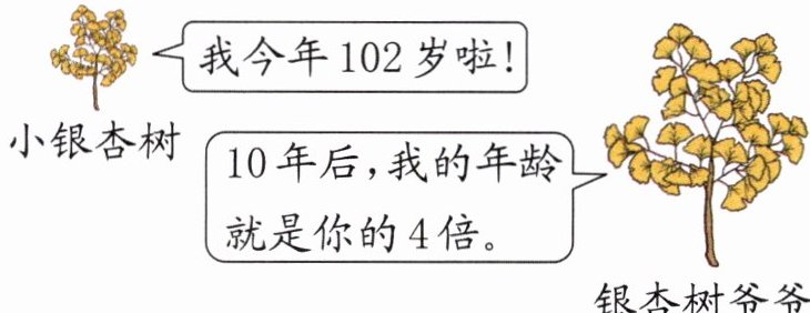 102+10=112(岁) 112×4=448(岁) 448-10=438(岁) 解析:根据银杏树爷爷的话,先算出10年后小银杏树的年龄为102+10=112(岁),则10年后银杏树爷爷112×4=448(岁),再减去10岁,就是银杏树爷爷今年的年龄。