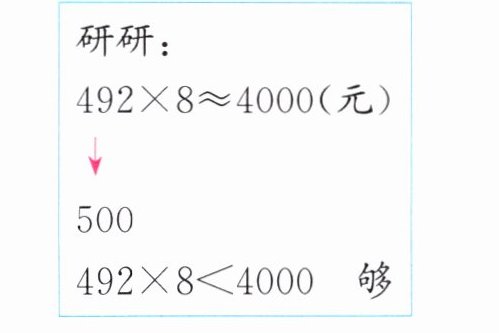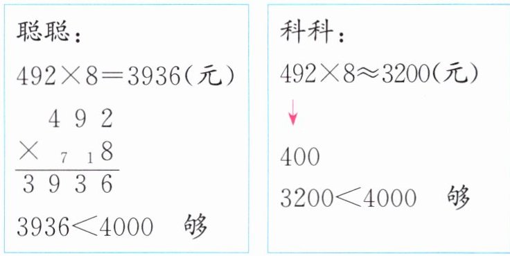 (2)(昆明五华区)某小学组织492名学生去科技馆参观,门票每张8元,带4000元买门票够吗?聪聪、科科、研研三名同学都认为带4000元买门票够,下面(
